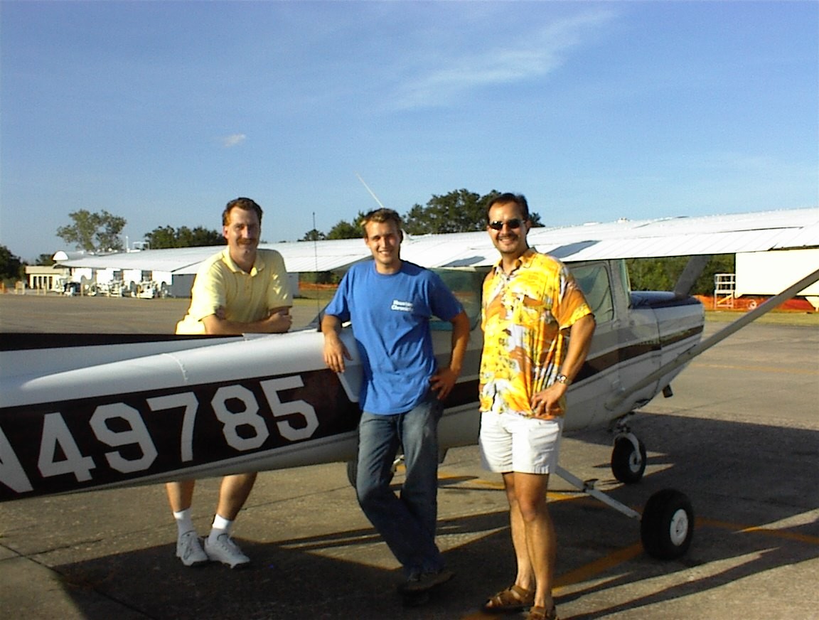 Well, second flight up with Andy Fay, my CFII instructor, and I had a blast again. This time, we headed out over Lake Sommerville and practiced "slow flight". Basically, we ran our Cessna 152 as slow as she would go and still maintain lift. Oh, and the best part of the flight? I got to take off! Giddy up! What a rush. I now have a total of 2.1 hours of flight in the log book.Pic is John Walter (left), Andy Fay (middle), John Romero (right)